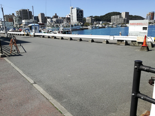 ⑩港へ入りすぐを左折。さらに左折して進む。左手の車に注意しながら進む。越えてすぐが駐車場となる